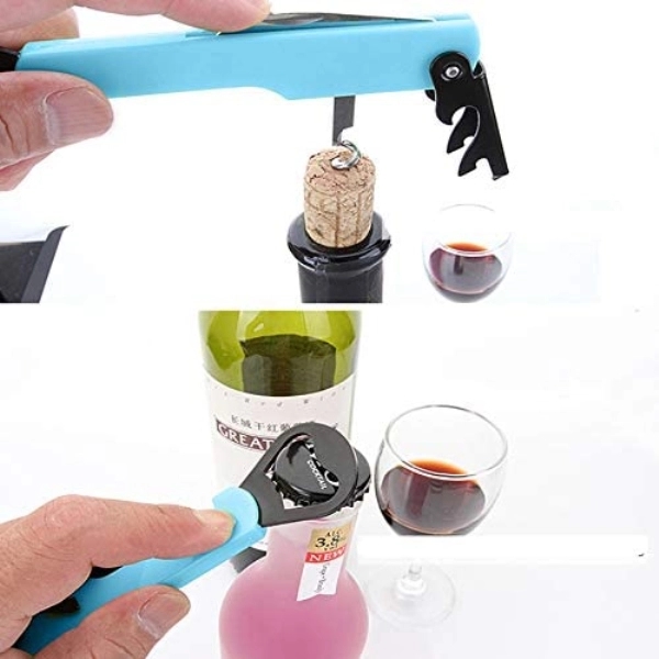 4-in-1 opener with a metal bottle opener, can opener, corkscrew, and knife.