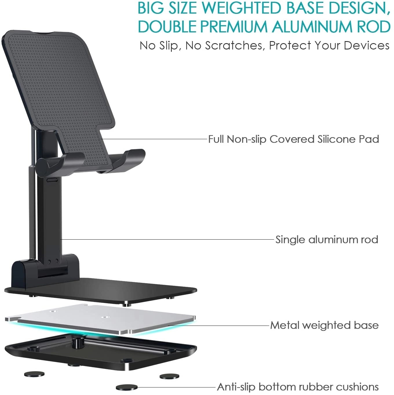 Adjustable handle and height phone stand made of an aluminum alloy rod and metal weighted base.