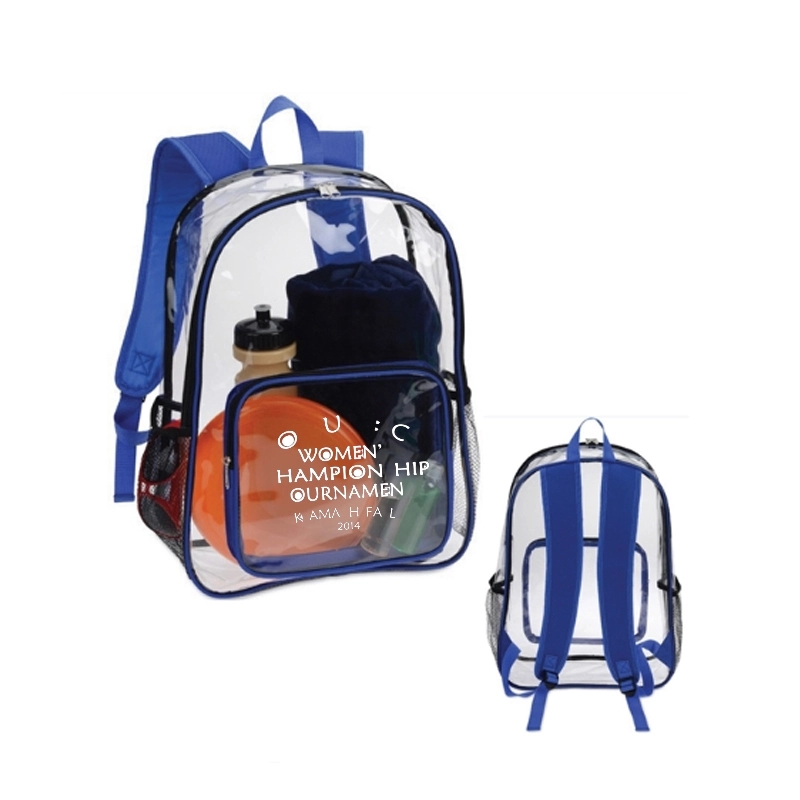 Get a hold of more customers when you offer this clear backpack! It's made of PVC material with black trim, 0 .3kg, a top handle, and features adjustable padded shoulder straps. This is waterproof, easy to wipe clean with a cloth, and also has a reinforced bottom. Also included is a front zippered pocket and two side mesh pockets. This is perfect for handing out at the next tradeshow or conference. Add your company name or logo for maximum visibility. Surprise everyone with something new and unique!