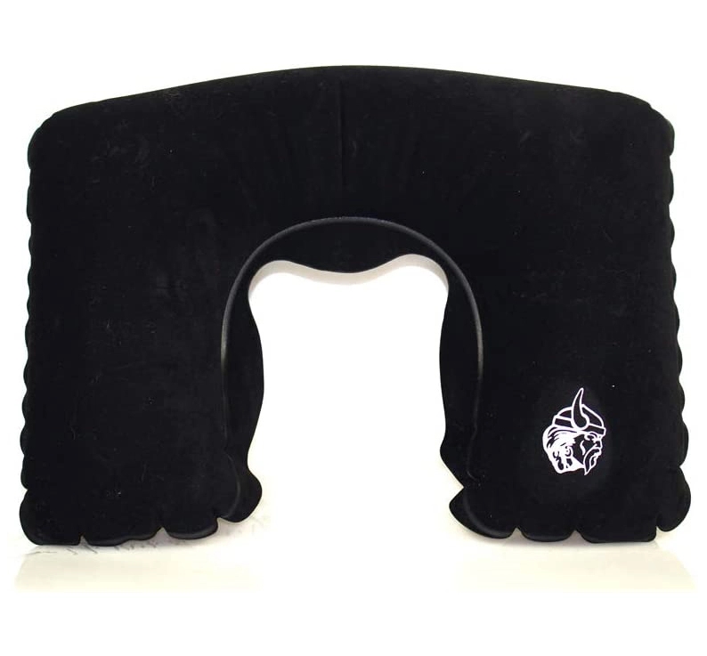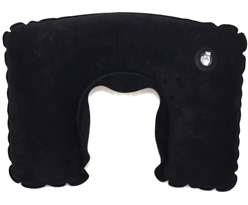 U-shaped inflatable neck pillow with pouch that cradles the head and neck softly and supportively.