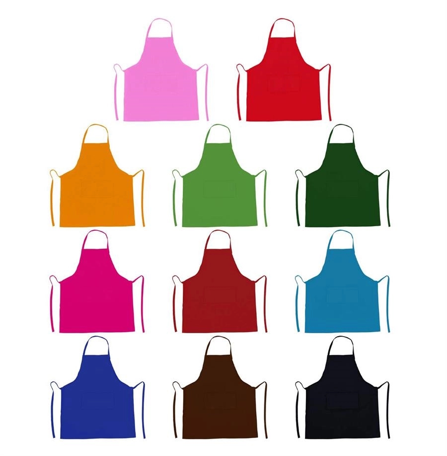 Kitchen apron made of polyester and cotton with two center pockets.