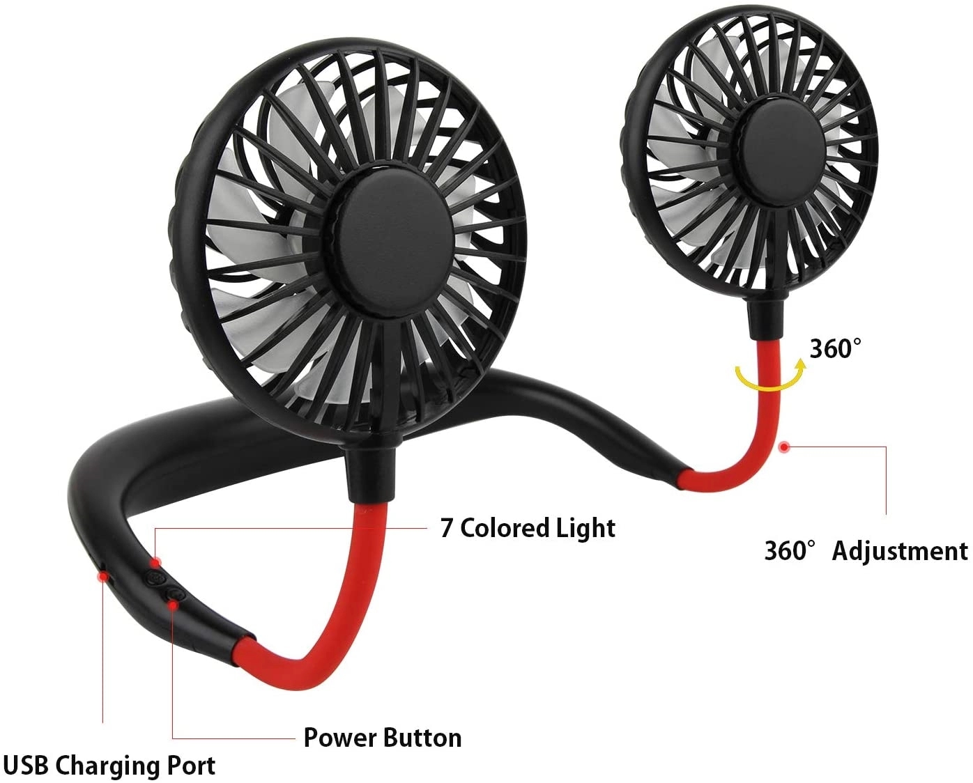 Hand-free portable neck fan with a unique headphone design, 7-color LED light, and three adjustable speeds.