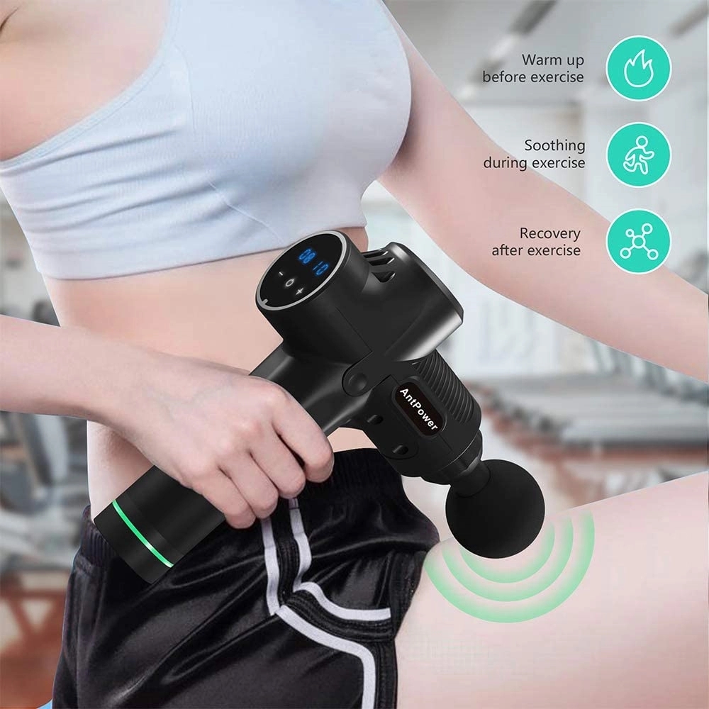 LCD display percussive deep tissue percussion massager for speeding up warmup and recovery.