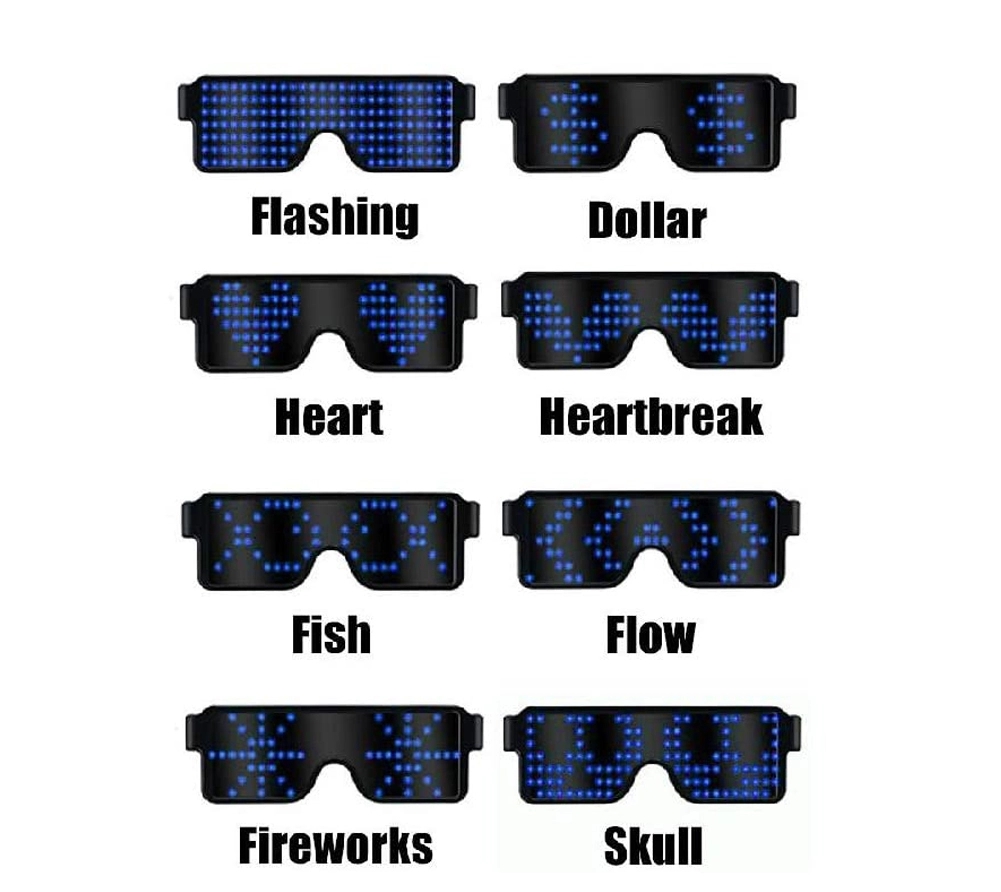 LED party sunglasses with USB charging and 8 animations to switch between.