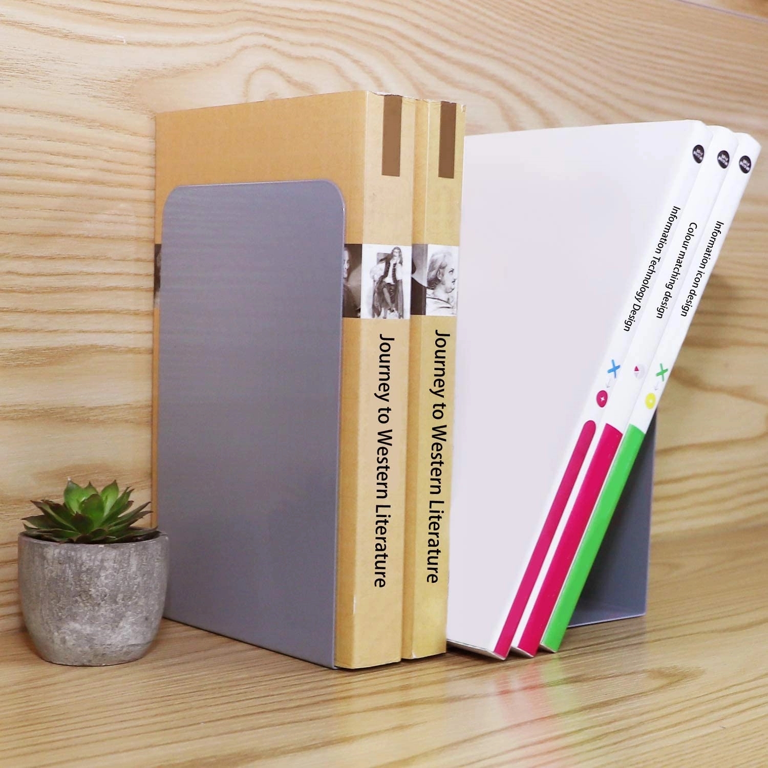 Bookends made of high-quality metal with an L-shaped support that takes no additional room on your shelf.
