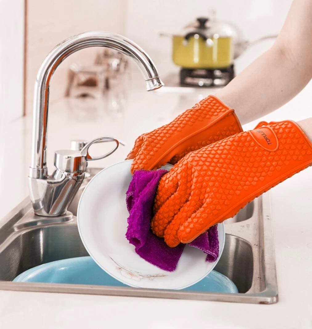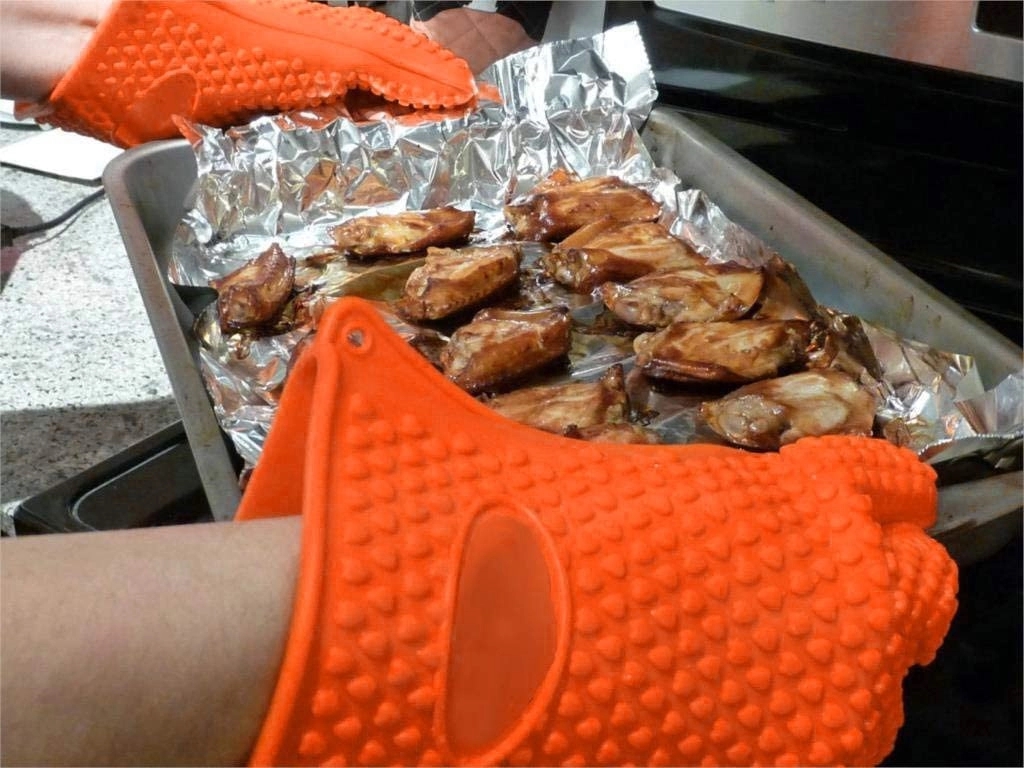 Oven mitts made of silicone for keeping you safe from the heat when pulling food out of the oven.