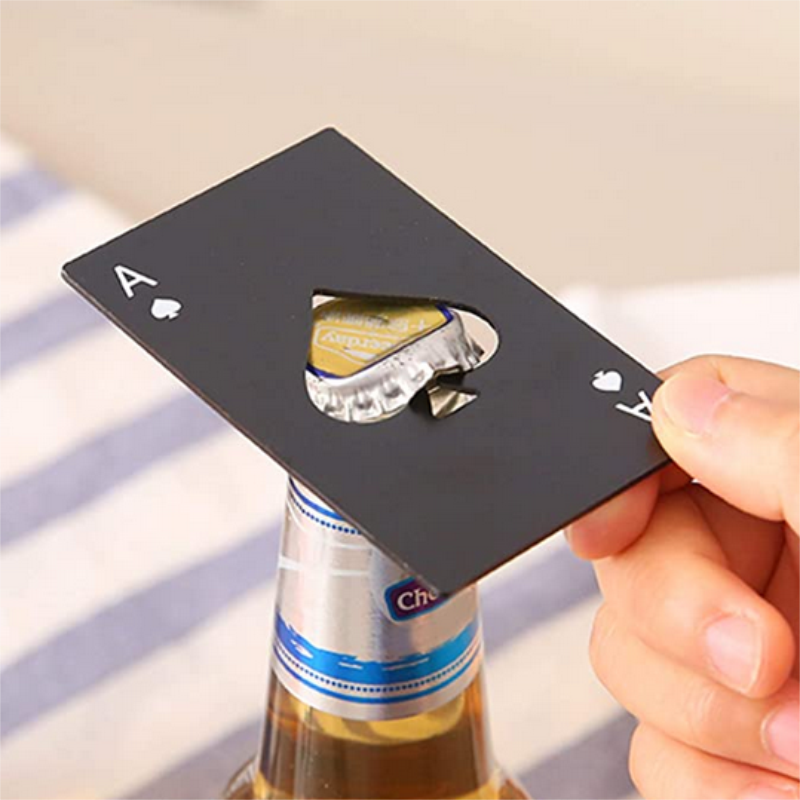 Poker shaped playing card bottle opener with the ace of spades design.