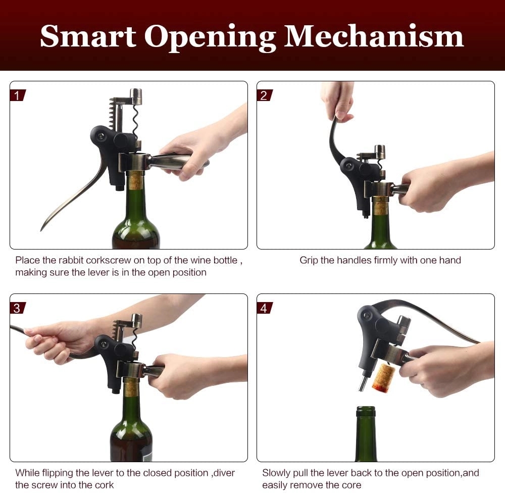 Rabbit shape wine opener with a foil cutter, a long durable spiral worm, and a gift box.