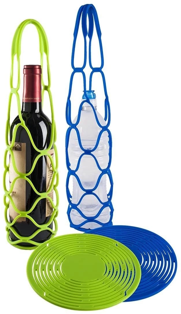 Bottle carrier made of silicone that will automatically conform to the shape of the bottle when you pull up on the outside ring.