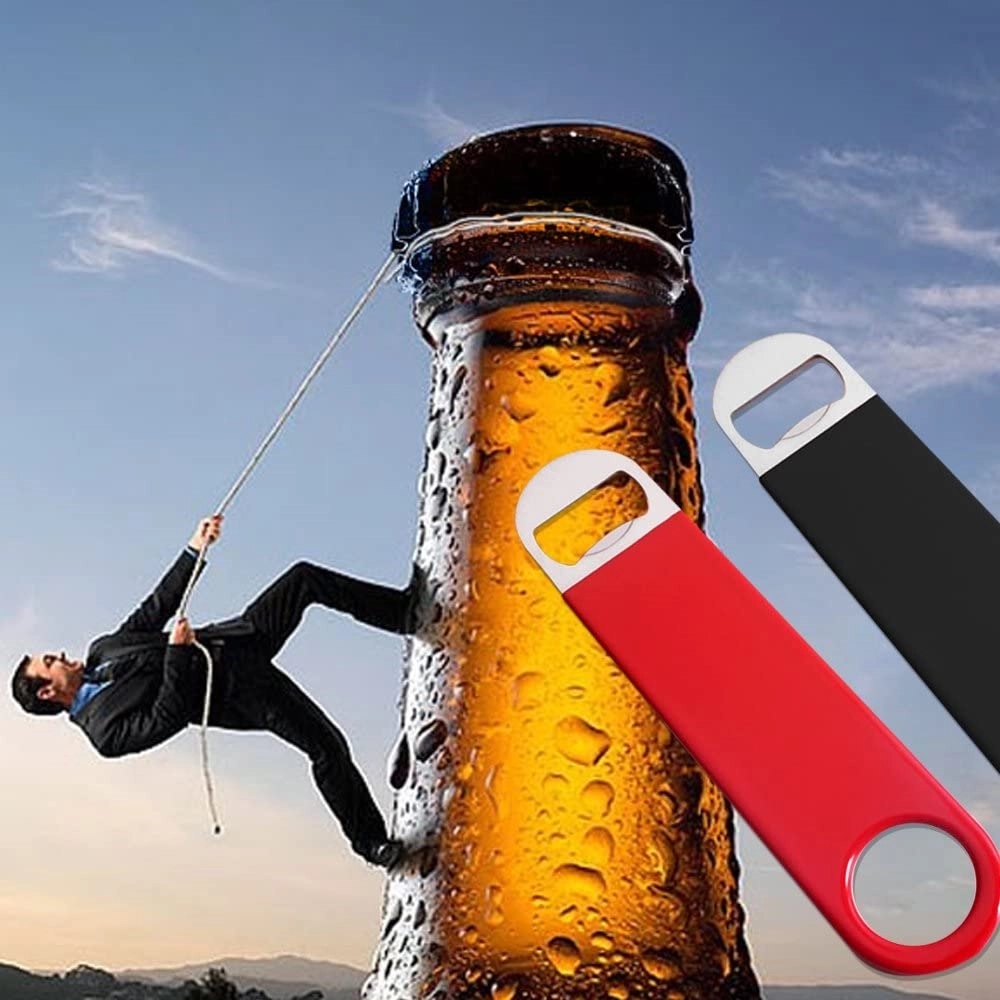 Get customers to shop with you first for all their needs when you give them this bottle opener! Made of stainless steel, this 7" L item features a vinyl grip coating for easy, non-slip use and a long neck, allowing for even more leverage when prying open your favorite brew. It's a must for bars, restaurants, taverns, pubs, backyard barbeques, and more. Add your company name or logo and make your event rock and cheer up everyone. Let clients know they can't go wrong when they choose you!